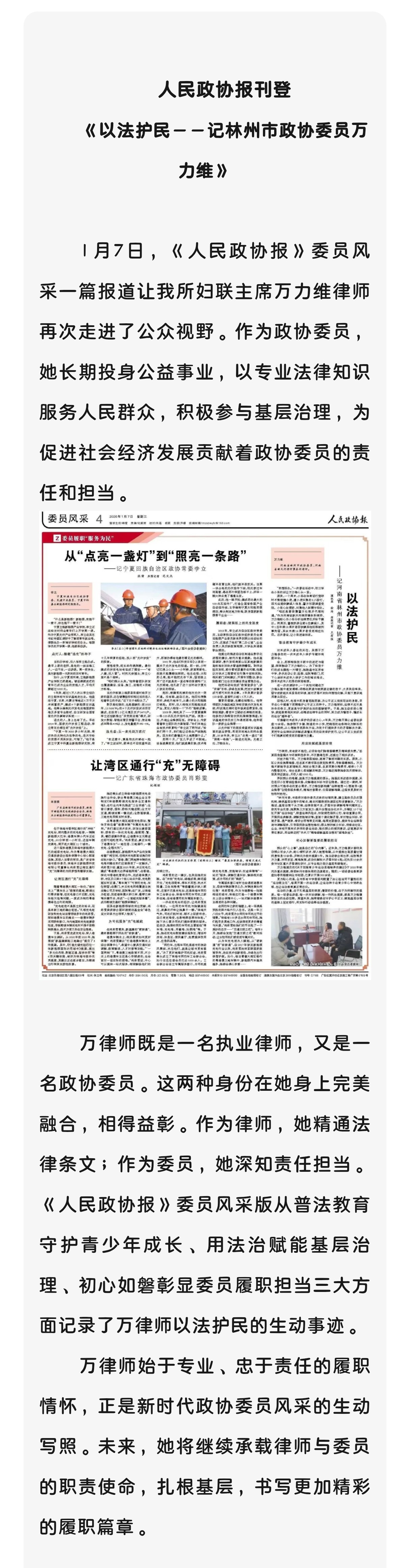 人民政协报刊登《以法护民——记林州市政协委员万力维》