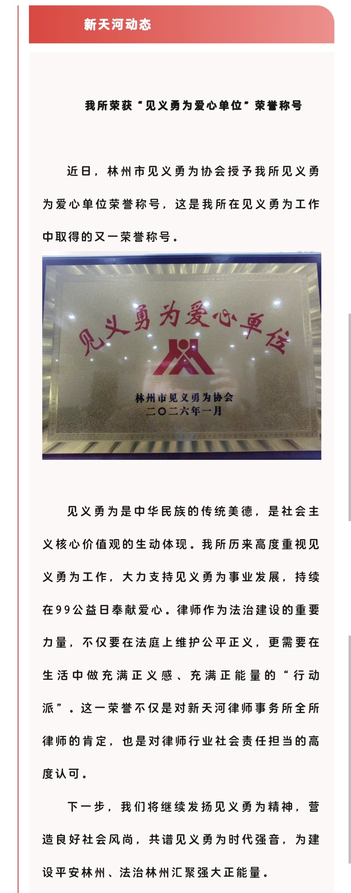 我所荣获“见义勇为爱心单位”荣誉称号